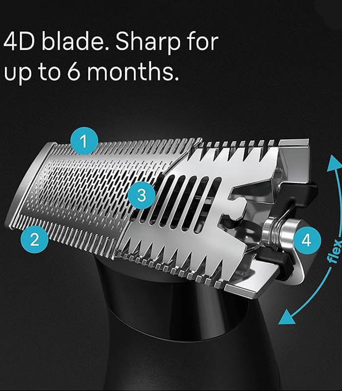 Purchased this to replace an older trimmer. The 4D blade system feels gentle on the skin and does not cause irritation. The attachments are simple to fit on. Works well dry or with shaving gel. A clean, functional design overall.