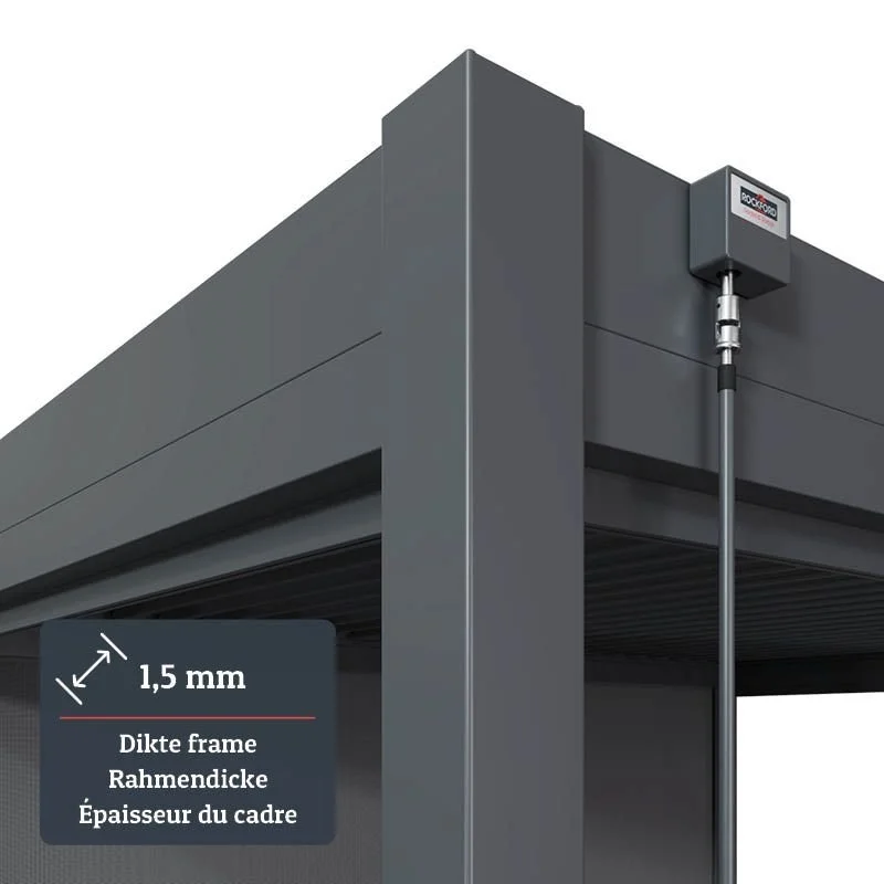 The Rockford Basic (3 x 3 m) is a freestanding aluminium pergola designed for durability, style, and comfort. Its sturdy aluminium frame in anthracite (RAL 7016) is weather-resistant and features an integrated water drainage system, allowing you to enjoy your outdoor space even during rain. The manually adjustable louvers make it easy to control sunlight and shade according to your preference.